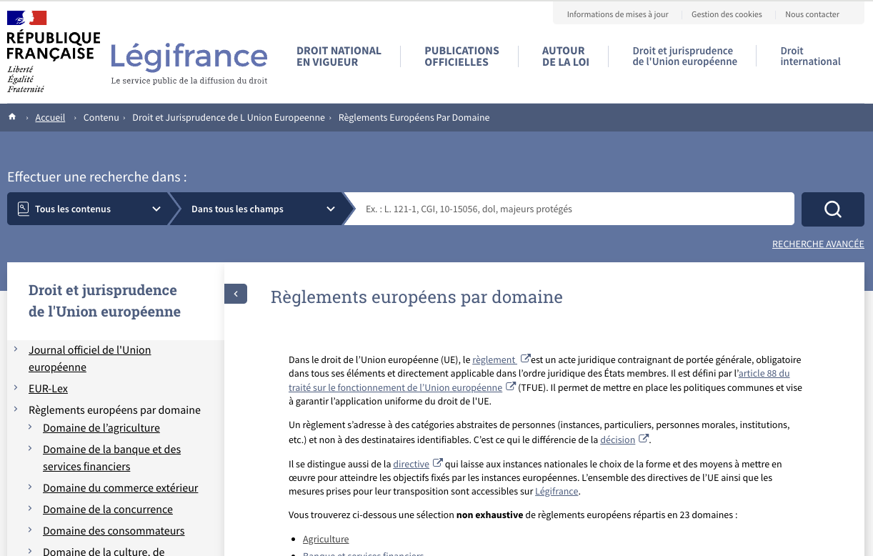 Nouvelle rubrique sur Légifrance : Règlements européens par domaine